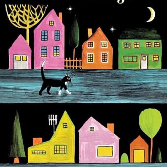 Legendary artist Dahlov Ipcar mesmerizingly alternates between dark night scenes and vivid color to deliver a beautifully illustrated children’s classic. Each scene is shown first as a human would see it at night in blacks and whites, and then as a cat sees it in with vivid color and fine detail.